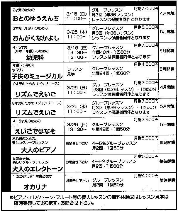 春の新講座 ヤマハ音楽・英語教室1日無料体験日程