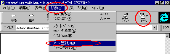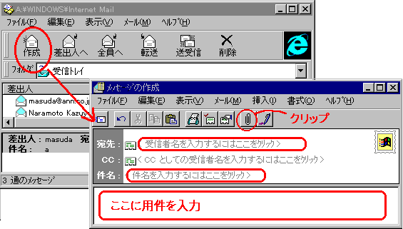 ![]() 1.メールの送信 1)[作成]ボタンクリックでメッセージの作成画面を表示させる。 ![]() 2)宛先覧に相手のメールアドレスを入力する。 メールアドレスは半角で入力のこと。 3)件名を入力する。 用件を的確に伝えるような件名とする。 例えば「4月20日の花見をどこでしますか?」と言った感じ。 4)用件を入力する。ちなみにクリップにて添付ファイルを付けることができます。 5)[ファイル]-[送信]にて送信トレイに置かれます。 引き続きメールを作ります。1)から繰り返し。 6)[送受信]ボタンクリックにて実際の送信となります。 2.メールの受信 1)[送受信]ボタンをクリックするだけです。 3.メールの削除 1)必要無いメールをクリックし、[DEL]キーを押すことで削除されます。 |